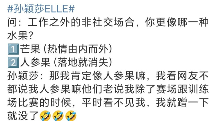 在这个采访中,主捏东谈主问孙颖莎像那种生果,一共有两个选项,分歧是芒果(和蔼由内而外)和东谈主参果(落地就消散)。