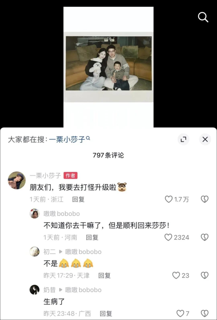 1月21日,“一栗小莎子”在发布全家福视频后留言“我要去打怪升级啦”,被网友解读为健康危机信号。