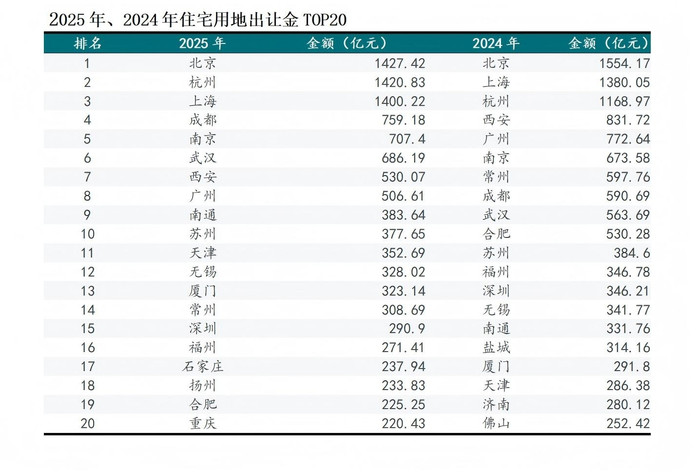 此外,西安从第4位跌至第7位,土地出让金降幅超30%。常州从第7位骤降至第14位,出让金近乎腰斩。合肥从第10位滑落至第19位,出让金降幅也超50%。而在2024年上榜的盐城、济南、佛山,在2025年则退出前20名。这些城市或受供地节奏,或遭遇了房企策略调整的冲击。