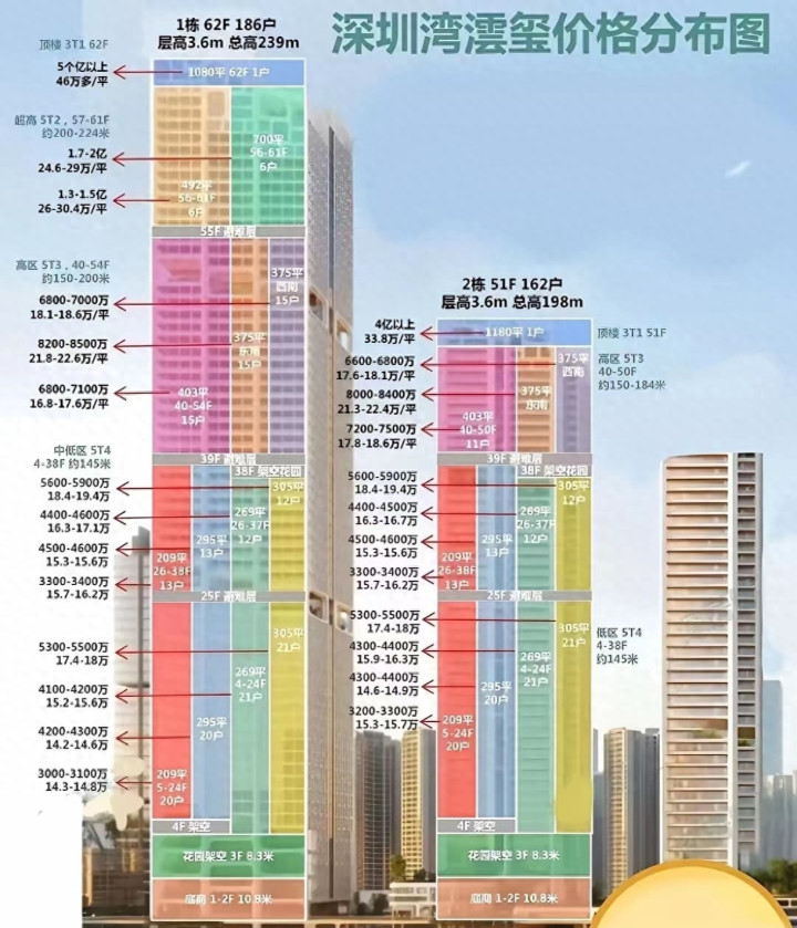 深圳湾云玺作为后海总部基地的“绝版宅地”,一天爆卖130亿的新闻刷屏。楼盘由华润与中海联手打造,以185亿元土拍总价刷新纪录,定位“城市次地标”。其5栋超高层住宅中,55层以上户型起步价1.3亿,顶层更是挂出5亿天价,单价突破25万/㎡。这样的价格高度,自然匹配了与其相称的安全配置。
