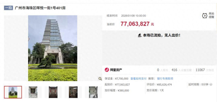 这两天,一套法拍房“火”遍全网。琶洲顶豪——保利天悦的一线望江楼王单位,居然打5折也没人要! 近日,一套位于保利天悦1号楼的建面约768㎡大平层挂上阿里法拍网,总价约7706万元,折合单价约10万元/㎡,而类似的户型,目前正常挂牌价为14800万元,单价高达19.5万元/㎡。 这套法拍房之所以备受关注,主要是因为其稀缺性 。其一,保利天悦是琶洲公认的豪宅,坐拥头排望江位置。其二,1号楼算是小区内的楼王,无遮挡望江,全栋采用一户一层+两梯一户设计,仅有29套房源。 虽然头顶多项“光环”,但该套房...