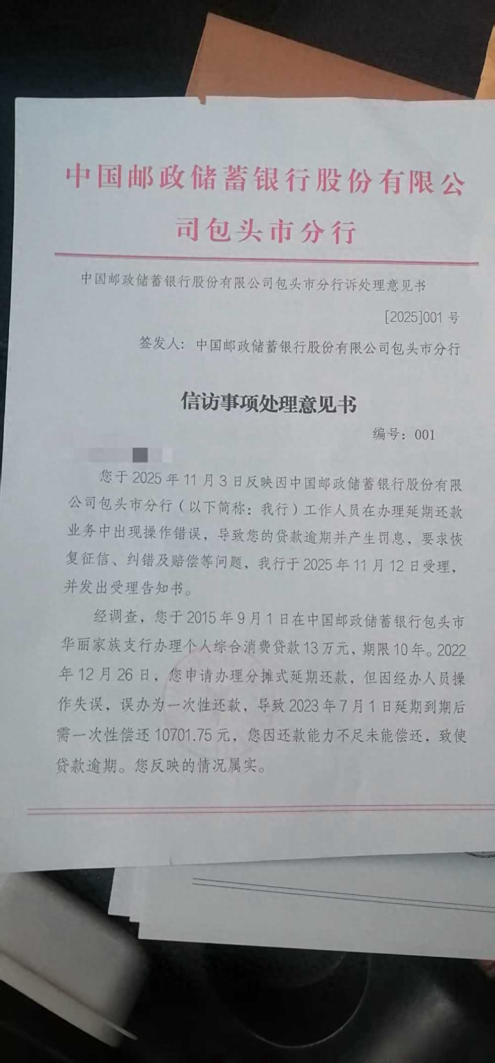 2015年,王小明在邮储银行包头的一个支行申请了13万元装修贷款,约定十年还清,前七年他都按时还款,信用记录一直良好,到2022年底,他想把接下来半年的月供分摊到后两年,减轻还款压力,这种操作比较常见,银行方面也同意了。 结果到了2023年7月,这位客户发现情况不对,银行系统没按他要求的操作来执行,反而把他半年的还款改成需要到期一次性全部还清,他赶紧打电话询问银行,银行员工查了记录,当场承认是操作出了错,还说会立刻上报处理,可这一报上去就再也没有消息了。 从那之后,他跑了八趟银行,打了十几次客...