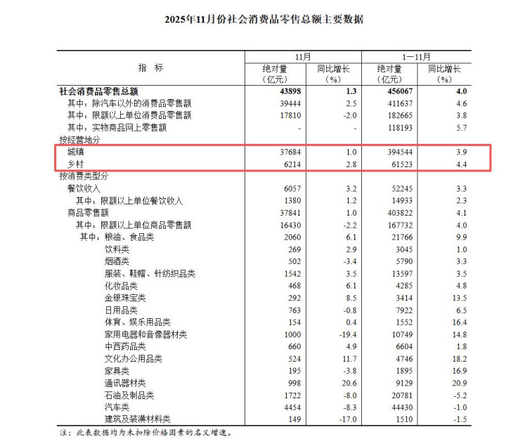 国家统计局公布:2025年1-11月社零总额同比增长4.0%;其中 乡村社零同比增长4.4% ,快于城镇的3.9%。