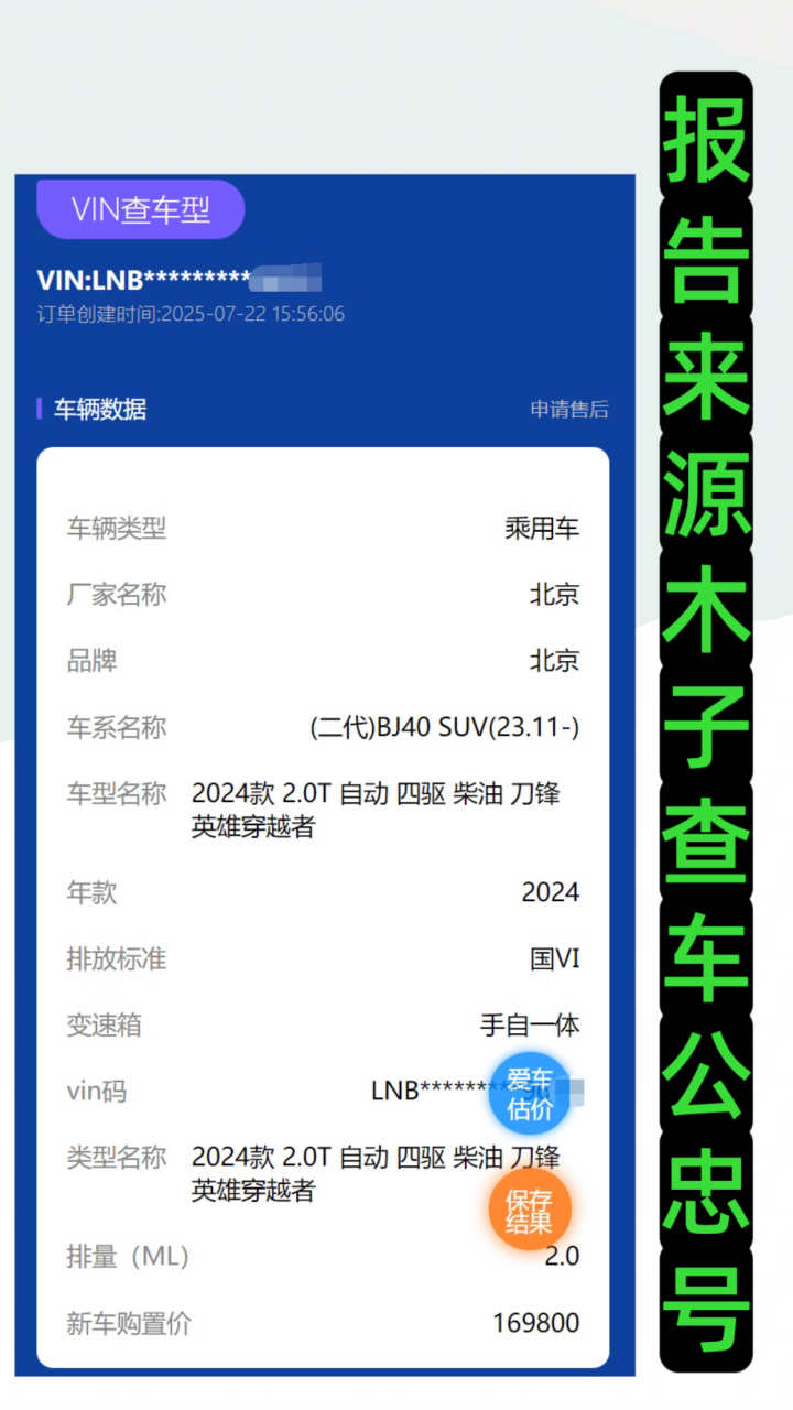 这里给大家推荐一个实用工具:关注 “木子查车” 公众号,在菜单栏找到 “车架号查车型” 功能,输入完整车架号,等待几秒就能获取权威结果。通过这个功能车架号查车型配置,能直接看到车辆类型、车系名称、车型名称、年款、变速箱、排放标准等核心信息,数据精准度高,完全能满足日常查询需求。