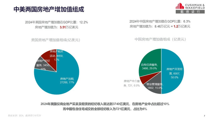 同时,我们认为,未来商业地产在房地产行业中所扮演的角色也将越来越重要。对比中美两国房地产增加值的构成,我们可以看到,2024年美国房地产增加值为3.51万亿美元,是中国的近3倍,其中美国的住房服务在其中占比达到77%,其住房服务涵盖的内容包括房地产出租,房地产经纪服务,房地产相关活动,这其中,开云app商业地产的租赁及买卖占比超过10%,2024年实现增加值3740亿美元。而在中国,2024年中国50%的增加值仍来自于房地产开发,自有住房服务占比为29%,其余两项为物业管理服务(15%)和房地产中介服务(6%),商业地产服务并没有做出细分,这也可能说明商业地产在房地产行业中扮演的角色依然较弱,同成熟市场相比具有很大差距。