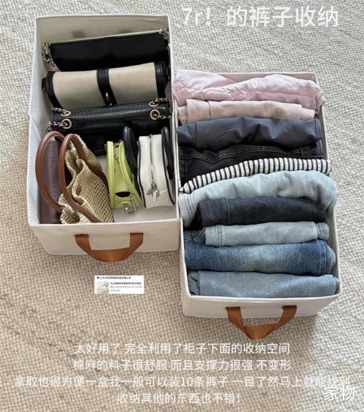 我买了俩布艺收纳盒,可以将裤子叠起来后竖向收纳在其中,每次拿放都能一目了然;多准备几个,也可以放内衣袜子等物,收纳起来更整洁。