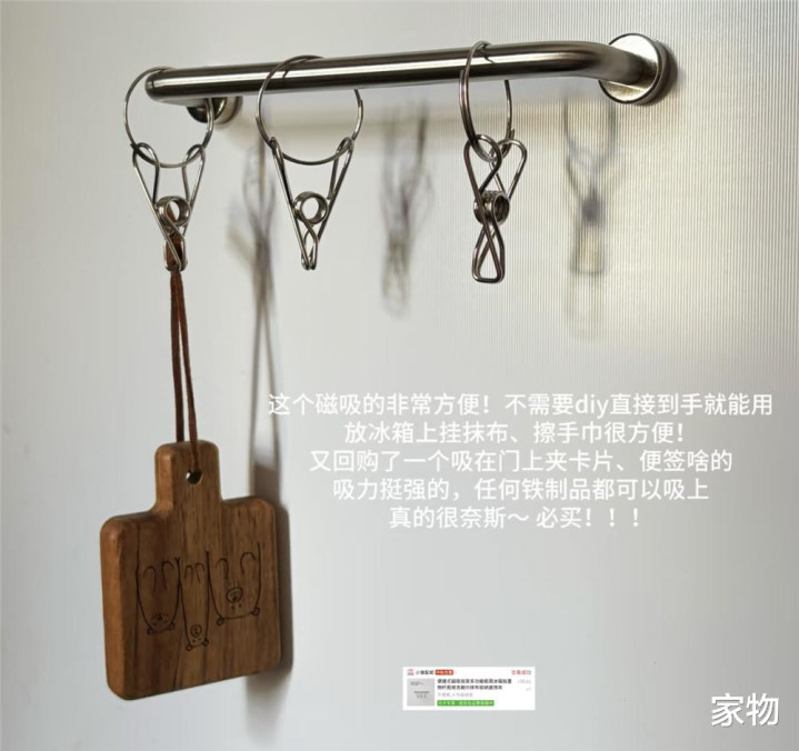 之前随手买了一个磁吸式的挂架,本来是想吸到防盗门上挂钥匙的,顺便挂些便签、卡片之类的东西很合适;后来发现吸冰箱上也很合适,就又买了一个,搭配个挂钩和夹子挂抹布擦手巾或者调味料袋子都不错。