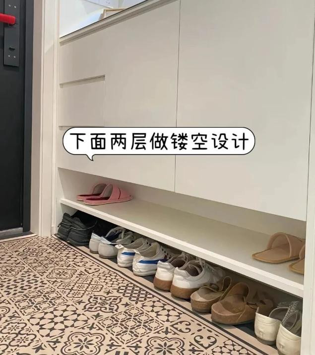 后来我看到邻居家的做法,是在鞋柜底部直接做成双层开放区,专门按使用频率来分。