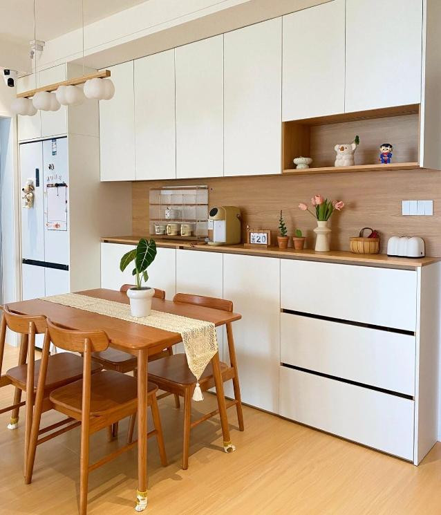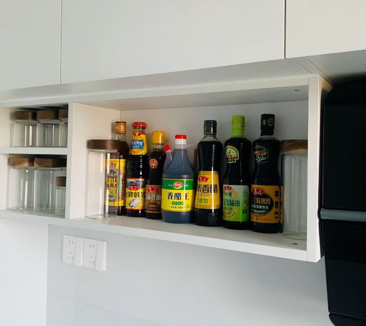 如果厨房电器多,还可以在高柜中间做抽拉式开放层,用的时候拉出来,用完再推回去,比一直敞着更干净。