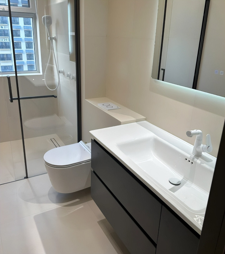 浴室柜悬空安装已经很常见,但如果旁边就是马桶,侧面留点空间反而更实用。