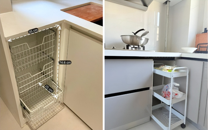 比如在橱柜里预留一小块开放区域,不管是放拉篮,还是塞一辆小推车,都比堆在台面上更顺眼。