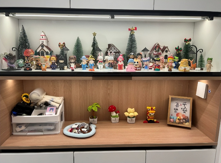 中间那层开放格,他们还拆成上下两层,上面随手放东西,下面加了上掀玻璃门,用来放一些不常动但又想展示的小物件。