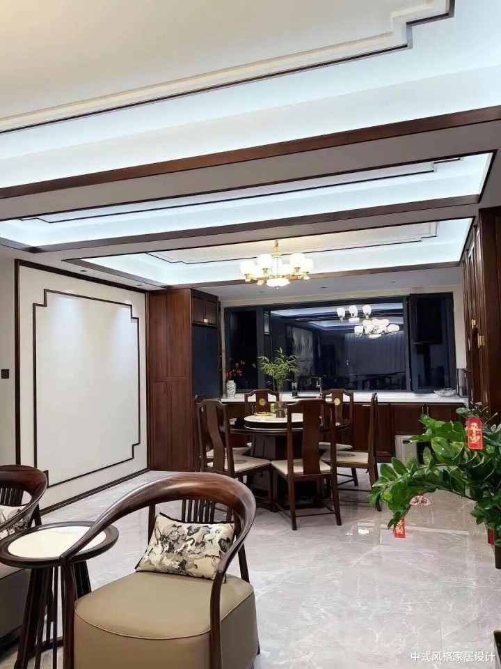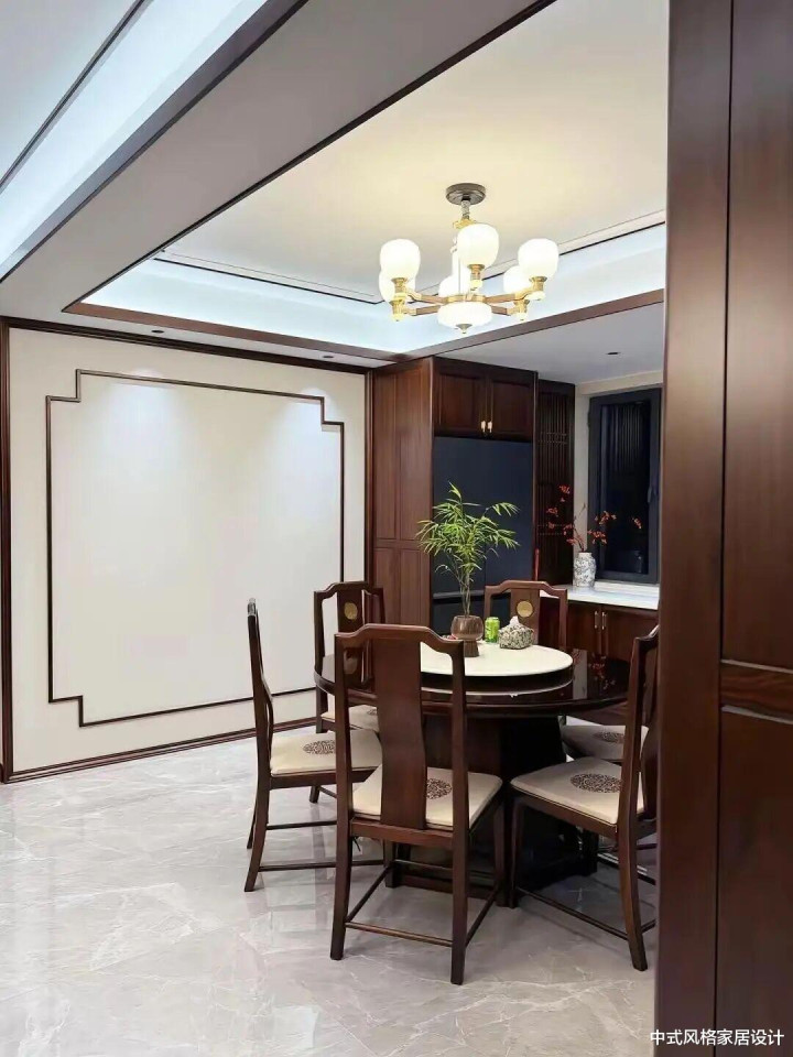 顶部为双层吊顶,暗藏灯带勾勒边框,搭配水晶吊灯增添轻奢感。墙面以白色为底,开云官方体育app下载辅以深色木质线条勾勒方形轮廓,与同色系实木家具呼应,凸显中式对称美学。中央摆放圆形餐桌,搭配深色实木餐椅,椅面铺浅色软垫,靠枕绣有水墨花纹。地面铺浅色大理石地砖,自然纹理与整体色调和谐统一。窗边绿植点缀,小摆件增添生机,营造出兼具传统韵味与现代舒适的居家氛围。