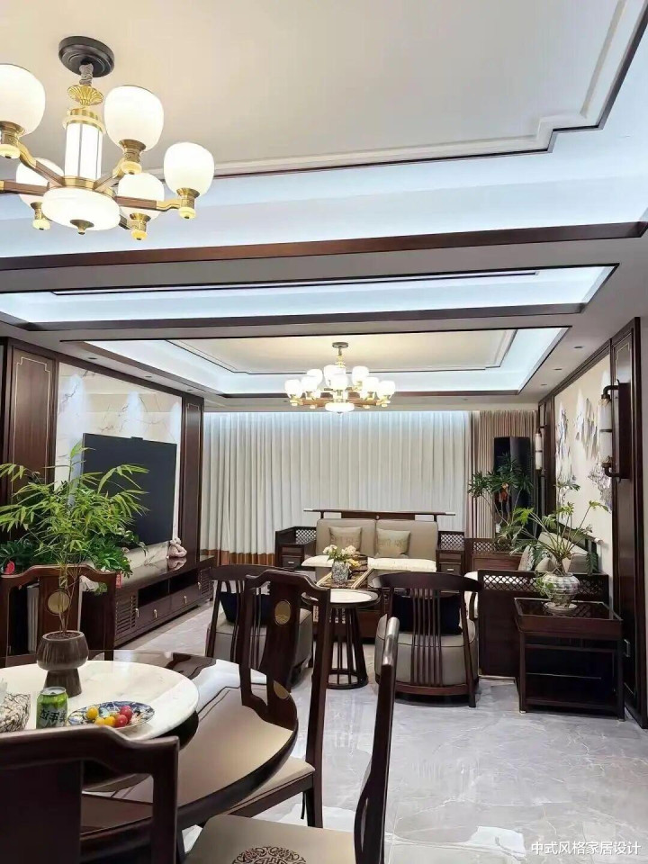 新中式风格客厅,整体雅致温润。实木家具(含雕花扶手椅、对称沙发)搭配米白窗帘与浅灰地砖,层次分明。顶部双层吊顶嵌入灯带,搭配古典吊灯,光影柔和。绿植点缀其间,圆形餐桌上茶具与点心摆放有序,营造出兼具传统韵味与现代舒适的居家氛围。