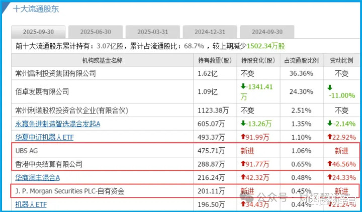 风险提示:本文为财报教学文章,不包含推荐行为,请勿据此操作,注意安全。 各位朋友,我是财官。今天,财官要带大家潜入一家被市场目光聚焦的公司——江苏雷利的财务迷宫。这份财报,表面风平浪静,实则暗藏玄机。 J. P. Morgan Securities PLC(摩根大通)、UBS AG(瑞银) 这两大国际顶级机构的自有资金赫然位列前十大流通股东; 香港中央结算有限公司更是大手笔加仓47%。这阵容,堪称“国际纵队”的潜伏。 与此同时,一个光环夺目的概念——“人形机器人核心部件供应商”,正为公司披上“...