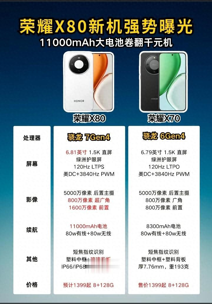 8:根据曝光信息,荣耀X80预计起售价为1399元(8+128GB版本),与荣耀X70的起售价保持一致。这意味着在价格不变的情况下,消费者能够获得更大的电池容量、更强的处理器和升级的前置摄像头,性价比优势明显。