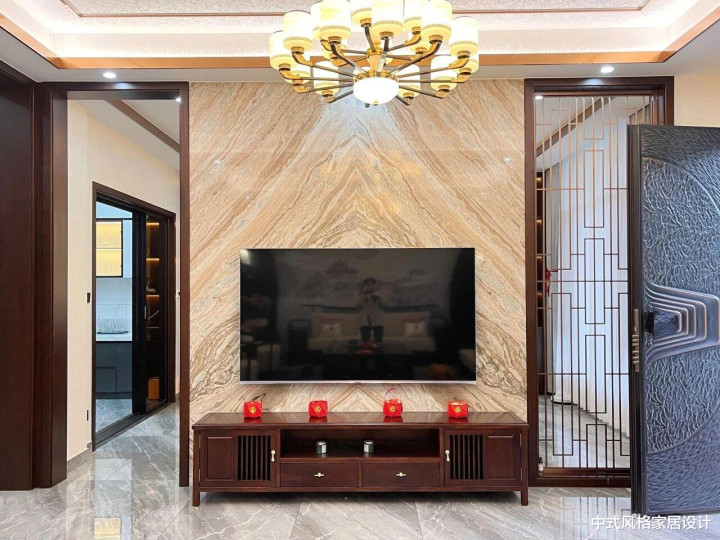 电视背景墙为大理石材质,纹理自然流畅,中央悬挂平板电视,下方配深色木质电视柜,右侧是竖条纹镂空隔断,顶部悬挂多灯头金色吊灯,灯光柔和洒落。地面铺浅色大理石地砖,开云与墙面色调和谐统一,展现传统与现代融合的雅致空间气质。