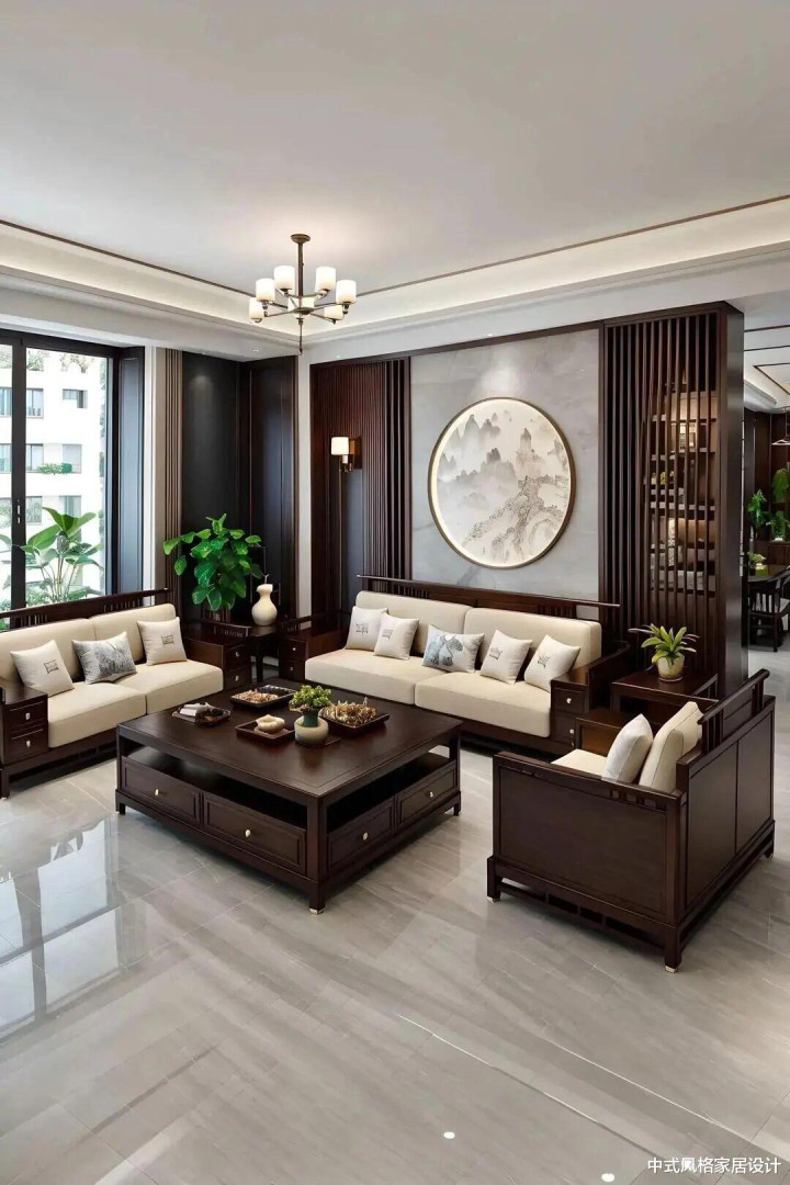 客厅,整体沉稳雅致。深棕色实木家具(三人位沙发、单人扶手椅、方形茶几)搭配米白色布艺坐垫,线条简洁流畅。背景墙以浅灰色为底,中央悬挂圆形水墨山水画,两侧木质镂空隔断兼具分隔与通透感。地面铺设浅灰色大理石地砖,自然光透过落地窗洒入,与绿植生机相映。茶几上摆放茶具与干果盘,细节处尽显东方美学与现代生活的融合。