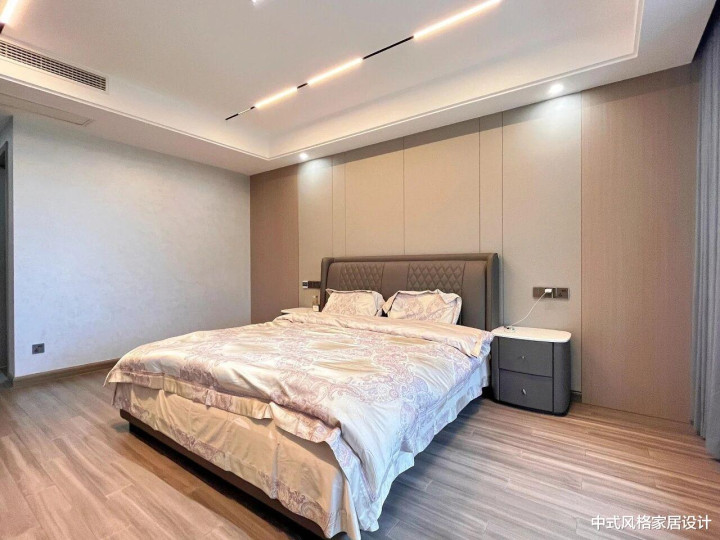 卧室,整体以浅米色与原木色为主色调,营造温馨雅致的休憩氛围。中央为双人床,铺浅色花纹床品,搭配深棕色软包床头,线条简洁。床侧是灰色抽屉式床头柜,柜面整洁;天花板嵌入线性灯带与筒灯,光线柔和均匀。地面铺设浅色木地板,与墙面同色系护墙板衔接,色调统一;窗帘半掩,自然光与室内灯光交融,凸显现代简约的利落与舒适。