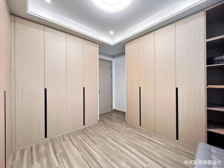 衣帽间,浅木纹色柜体搭配黑色细长拉手,线条利落。左侧为多门组合柜,右侧含开放格设计,整体与浅灰色木地板、白色吊顶及嵌入式灯带协调统一,营造简洁自然的居住氛围。