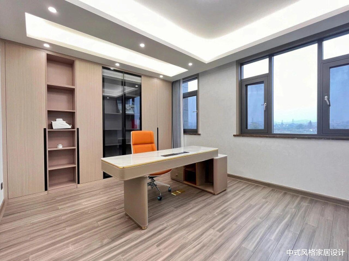 办公书房,整体设计简洁明亮。浅灰色墙面搭配浅木色地板,顶部嵌入式灯带与筒灯组合提供均匀照明。靠墙一侧设浅木色定制书架,兼具储物与展示功能;中央摆放长条形白色桌面会议桌,搭配橙色办公椅,桌下配同色系储物凳。大面积落地窗引入充足自然光,窗外可见城市建筑轮廓,营造开阔通透的居家办公氛围。