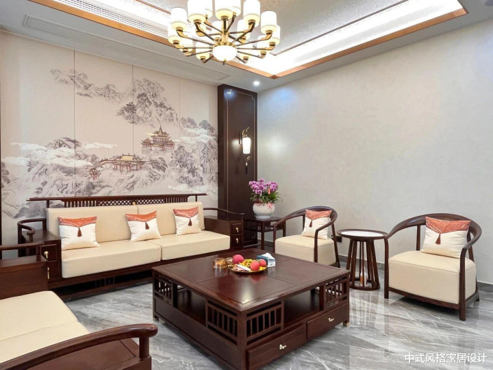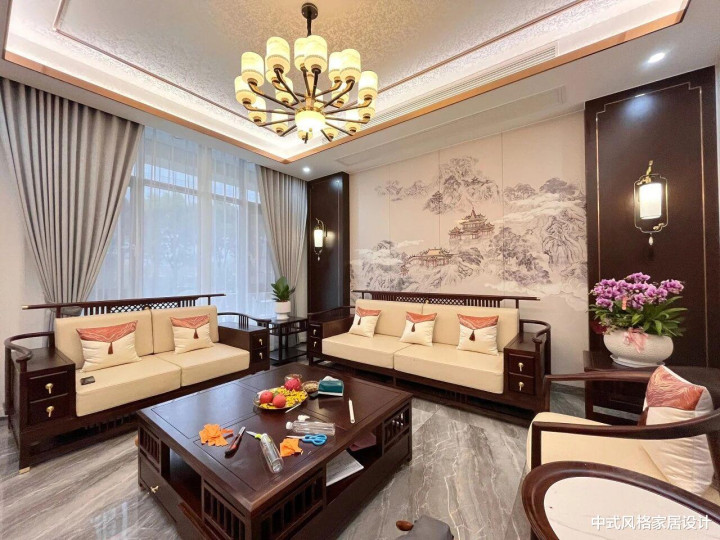 新中式客厅,整体设计融合传统韵味与现代简约。新中式家具:深色实木框架搭配米色软垫,线条流畅,两侧对称摆放,中间配深色茶几,上置水果与书籍。背景墙为水墨山水画,左侧落地窗配浅灰色纱帘,右侧深色木门旁有白色瓷瓶插紫色花卉。顶部悬挂多灯头吊灯,暖光与自然光交织,营造雅致温润氛围。