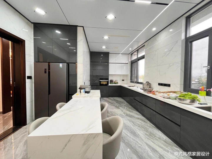 厨房,整体以黑色哑光橱柜为基底,搭配白色大理石台面与浅灰色水磨石地面,冷暖色调平衡。左侧嵌入式银色不锈钢冰箱与黑色柜体形成材质碰撞,右侧黑色窗框玻璃窗引入自然光,使空间通透。中央白色大理石中岛台配两把浅灰布艺餐椅(金属细腿),兼具用餐与操作功能。台面摆放绿植与餐具,细节处透着生活气息。