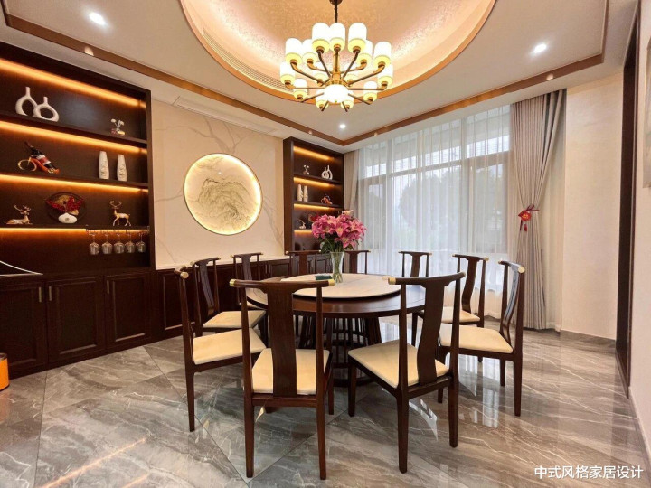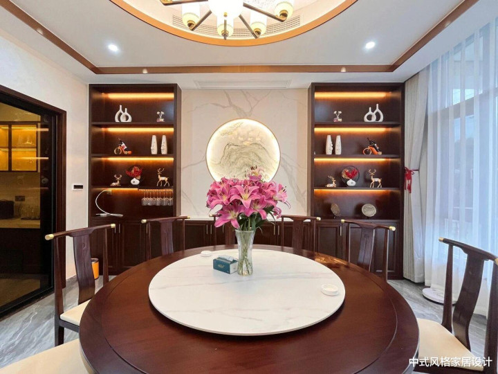 餐厅,整体以深棕色实木家具为基底,搭配米白色大理石地面与墙面,色调沉稳雅致。中央摆放圆形实木餐桌,搭配同色系餐椅,椅面铺浅色软垫;餐桌旁点缀一束粉色玫瑰花,增添柔美气息。两侧为深色嵌入式酒柜,内置暖光灯带,柜内陈列陶瓷摆件与酒具;墙面悬挂圆形水墨挂画,与酒柜形成对称布局。顶部圆形水晶吊灯散发柔和光晕,透过半透光窗帘洒入的自然光与之交相辉映,营造出温润而富有文化底蕴的用餐氛围。