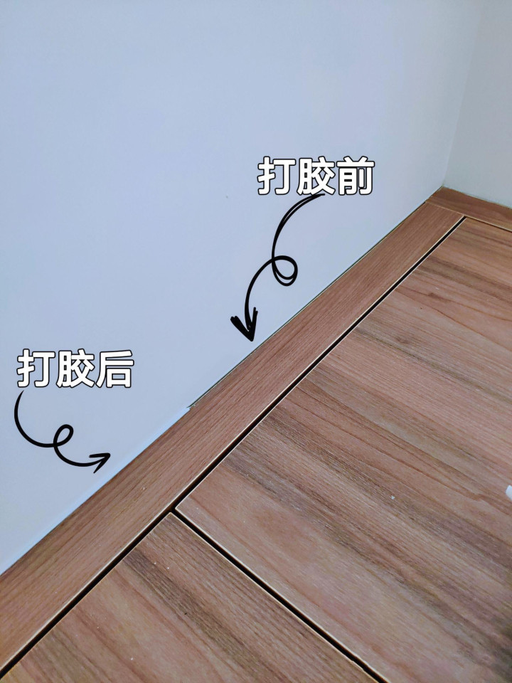 打胶注意:一般用美容胶就行,但是颜色的选择上,尽量选择和地面或者墙面较深的颜色;但如果你家层高偏低,建议选择和墙面颜色更相近的颜色(踢脚线颜色也是)。